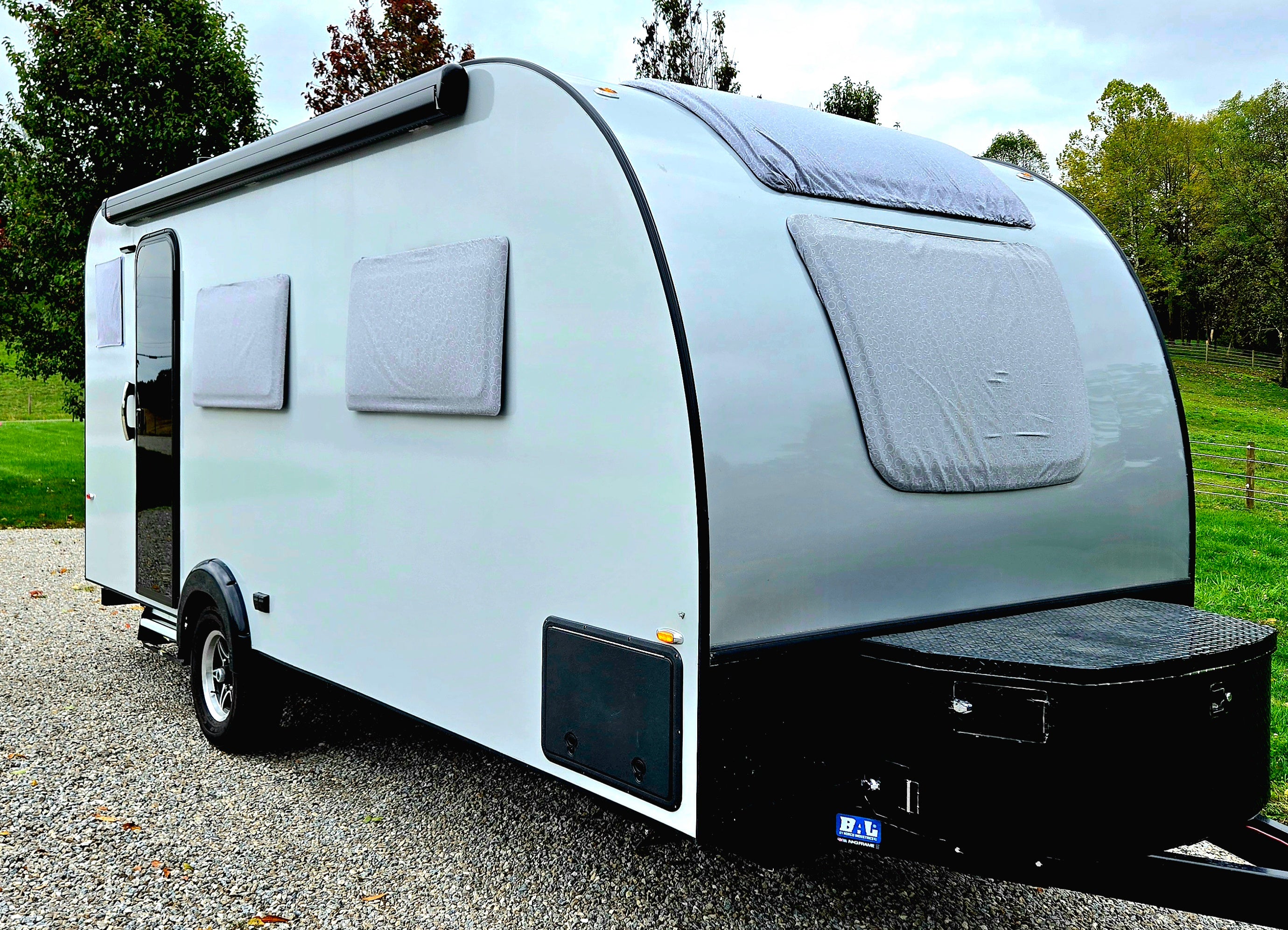 This strong well made cover is locally made right here in Ohio. We use Top Value Fabrics by SunMaster TM 7.5 oz. Solution Dyed 100% Polyester which is the perfect material for outdoor covers. 100% Waterproof and Breathable! We did thorough research to find the very best breathable material to ensure no sweating or mildew can happen between your trailer and the cover. SunMaster Fabrics are specially formulated to withstand harsh elements. With its excellent colorfastness as well as mold and mildew resistance; this cover is a superb choice for your nuCamp Haven Travel Trailer. Abrasion-resistant and easy to clean. This cover has a zippered door opening so you are able access the inside without removing the cover. Easy to install by starting in the back of the Trailer and pulling the Cover over the top and down the front. Also comes with adjustable straps which snap together underneath to keep your Cover secure. Covers the front storage bin as well.