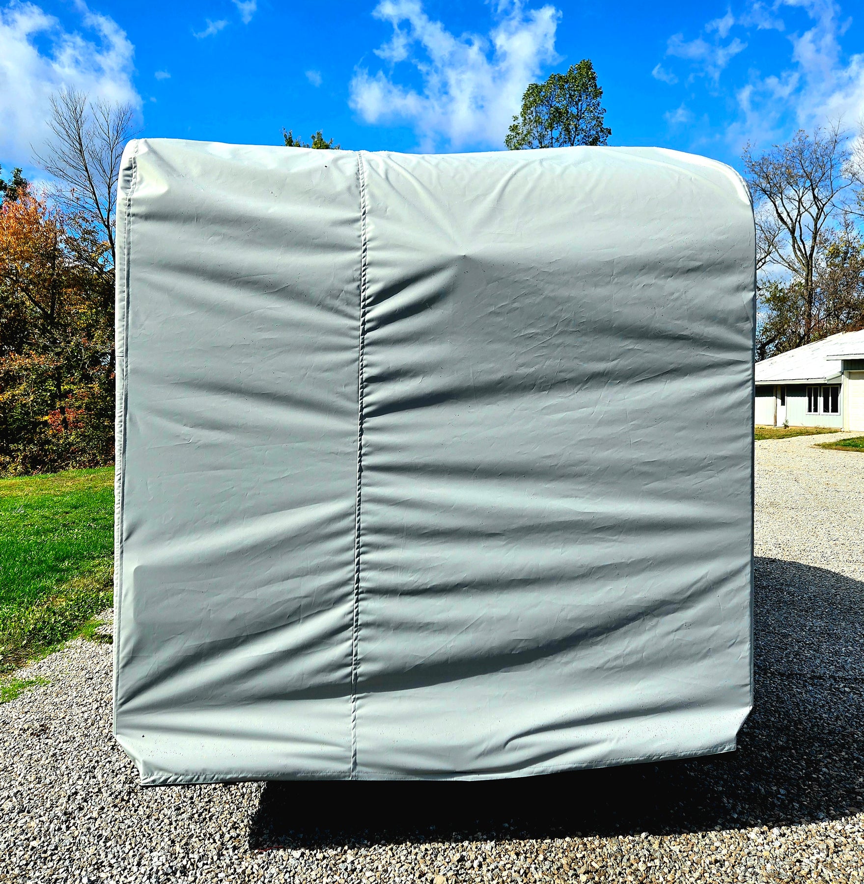 This strong well made cover is locally made right here in Ohio. We use Top Value Fabrics by SunMaster TM 7.5 oz. Solution Dyed 100% Polyester which is the perfect material for outdoor covers. 100% Waterproof and Breathable! We did thorough research to find the very best breathable material to ensure no sweating or mildew can happen between your trailer and the cover. SunMaster Fabrics are specially formulated to withstand harsh elements. With its excellent colorfastness as well as mold and mildew resistance; this cover is a superb choice for your nuCamp Haven Travel Trailer. Abrasion-resistant and easy to clean. This cover has a zippered door opening so you are able access the inside without removing the cover. Easy to install by starting in the back of the Trailer and pulling the Cover over the top and down the front. Also comes with adjustable straps which snap together underneath to keep your Cover secure. Covers the front storage bin as well.